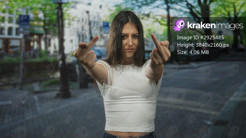 Woman holding up both middle fingers toward camera on a city street with visible bellybutton piercing and tense facial expression; defiance.