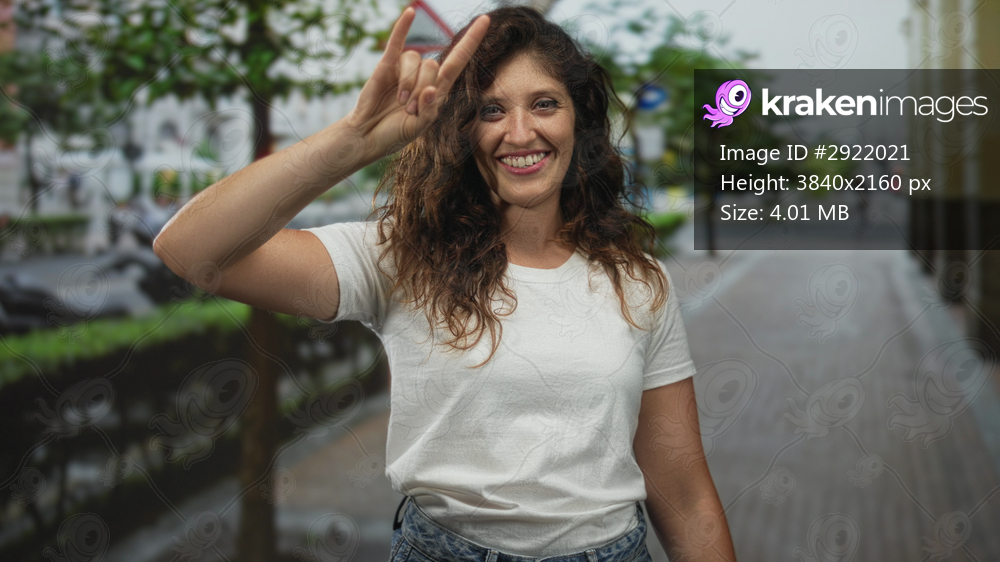 Woman holding up hand in rock horns gesture on street wearing white t shirt and smiling at camera; joy celebration.