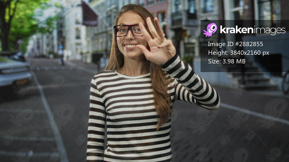 Woman holding up index finger and smiling on a city street in glasses and striped shirt; confidence playfulness.