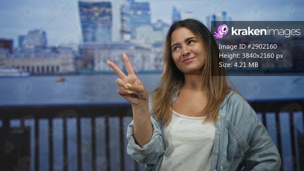 Woman holding up peace sign with hand by waterfront building and railing on the seaside; playful peace.