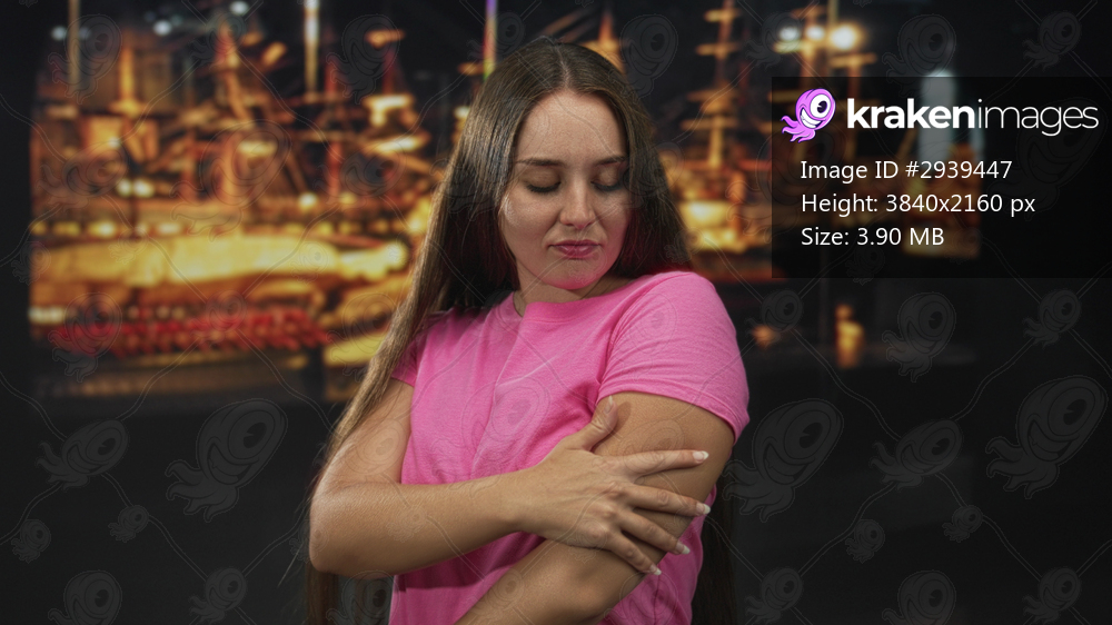 Woman holding upper arm in museum gallery near ship exhibit with eyes closed and slight grimace; introspection discomfort.