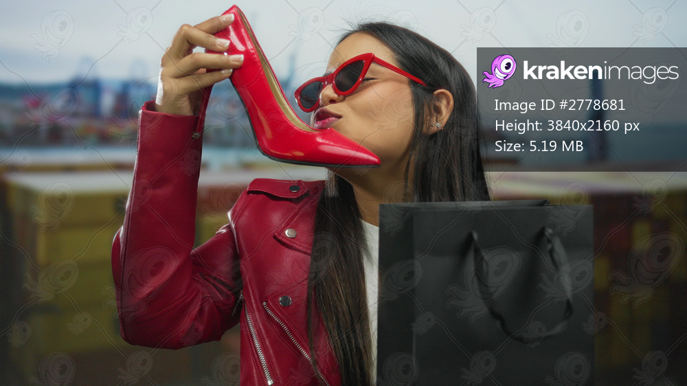 Woman holding vibrant red shoe and shopping bags outdoors at a port, embodying joy and style with a ship background and a sunny day atmosphere.