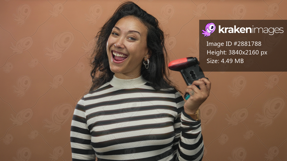 Woman holding video game controller and smiling in peach studio, striped top visible, showing tattooed hand and hoop earring; playful joy.