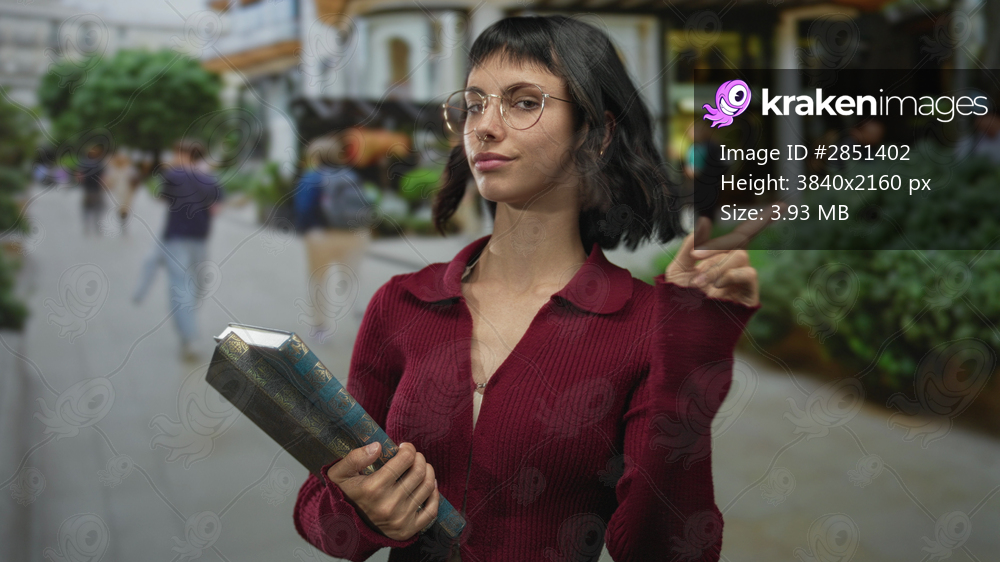 Woman holding vintage hardcover book points finger on urban street lined with greenery and shops; confidence.