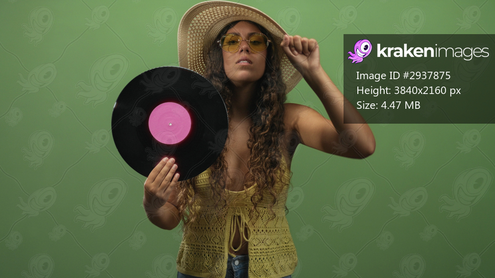 Woman holding vinyl record in studio, wearing sunhat and yellow sunglasses with hand raised in a dance gesture; playful retro music.