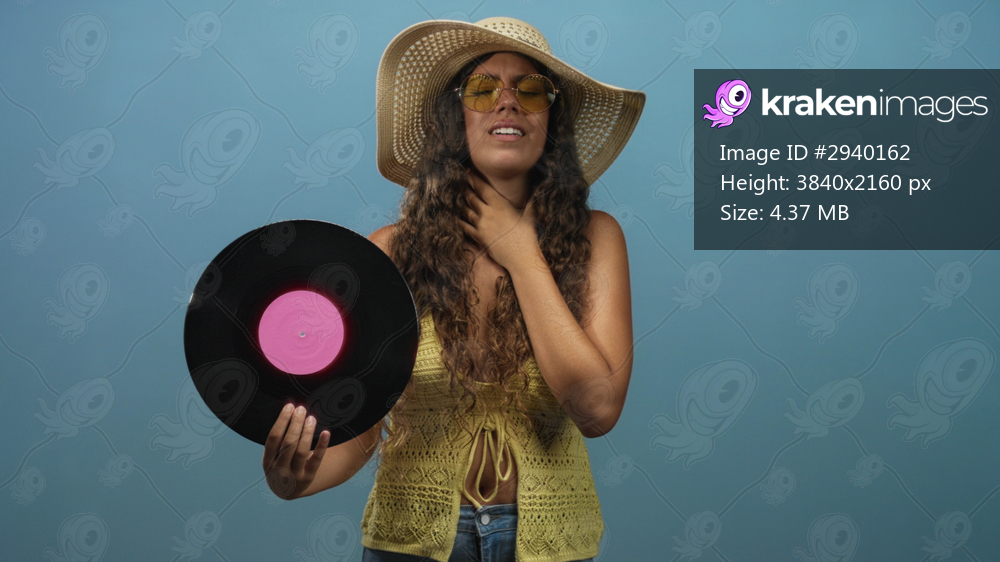 Woman holding vinyl record with pink label, hand to throat, wearing straw sunhat, yellow sunglasses, crochet top and denim jeans, curly long hair in studio; nostalgia retro summer. - Kraken Images
