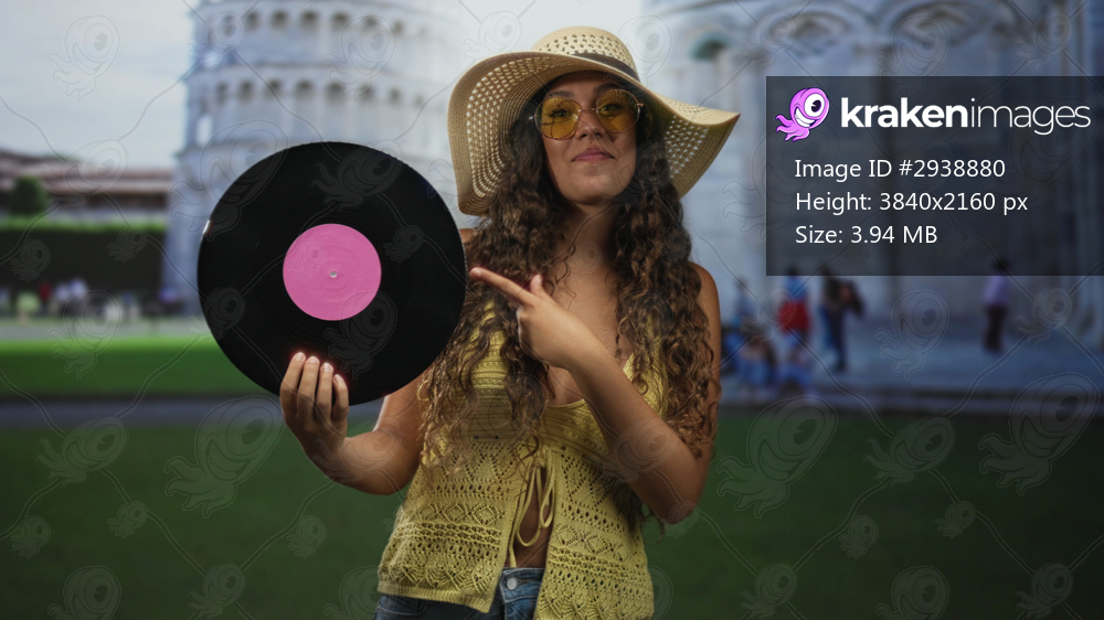 Woman holding vinyl record and points finger at record in front of building monument, wearing wide sun hat and yellow sunglasses; playful summer travel. - Kraken Images