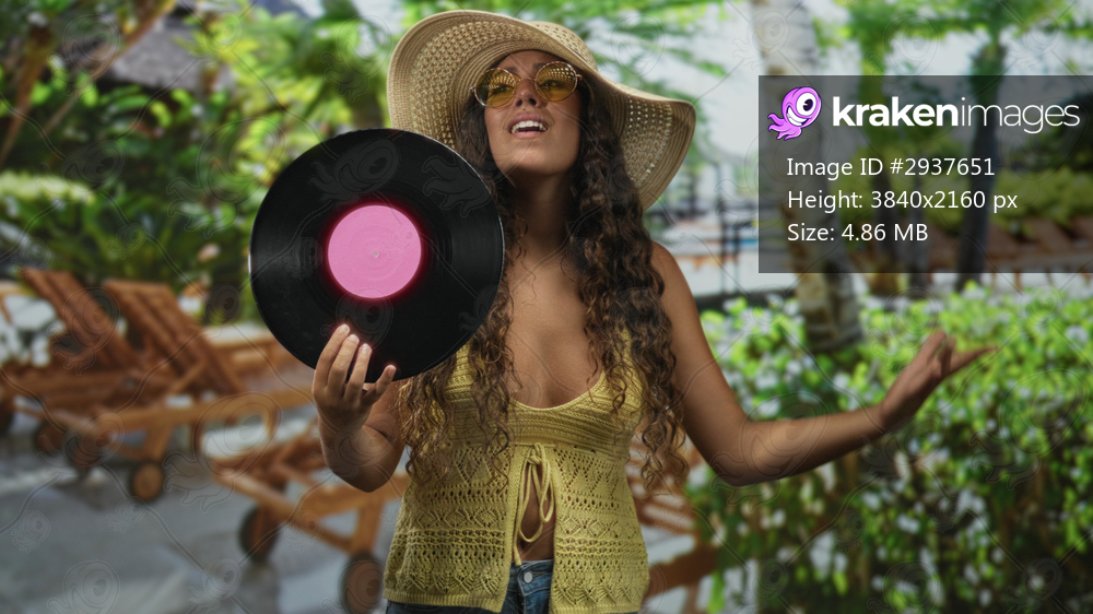 Woman holding vinyl record and smiling, hand raised at resort poolside with sunhat and sunglasses; vacation leisure carefree.