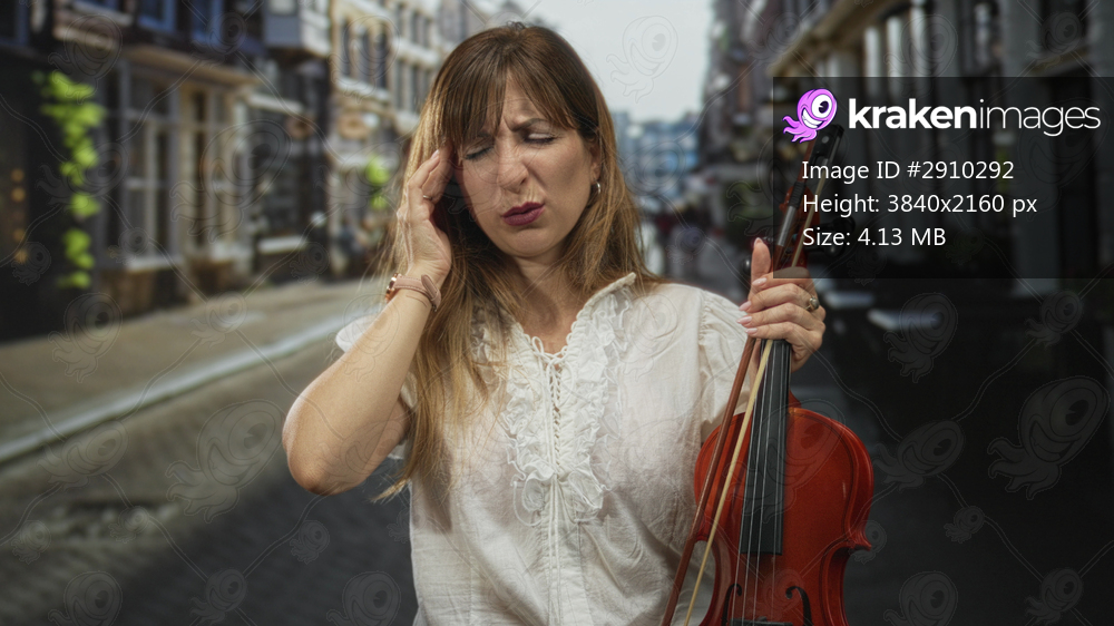 Woman holding violin and bow, left hand pressing temple while grimacing on a narrow cobblestone street lined with storefronts; pain.