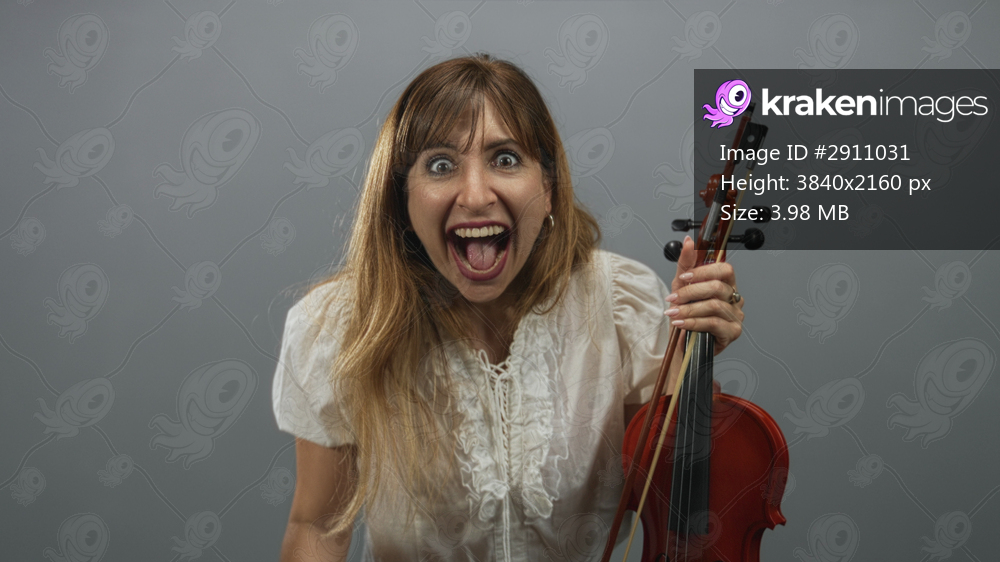 Woman holding violin and bow with open mouth shouting pose in gray studio wearing white blouse; raw excitement.