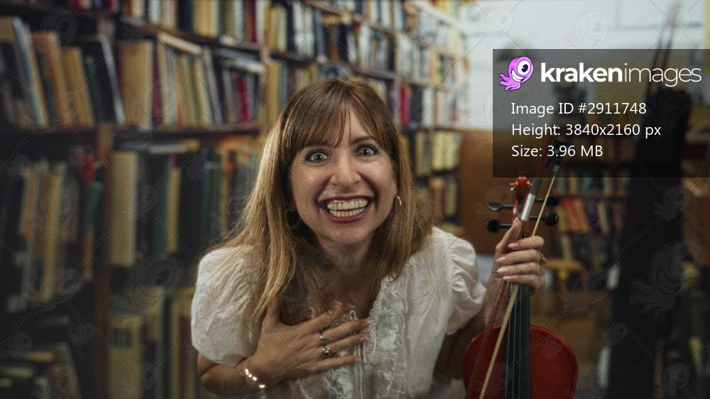 Woman holding violin and bow, smiling broadly and gesturing with left hand in a building; joy celebration.