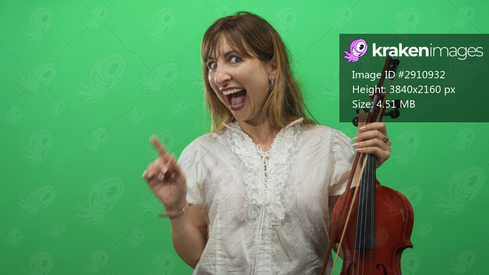 Woman holding violin and points finger to right in green screen studio, smiling with open mouth; excited performance.