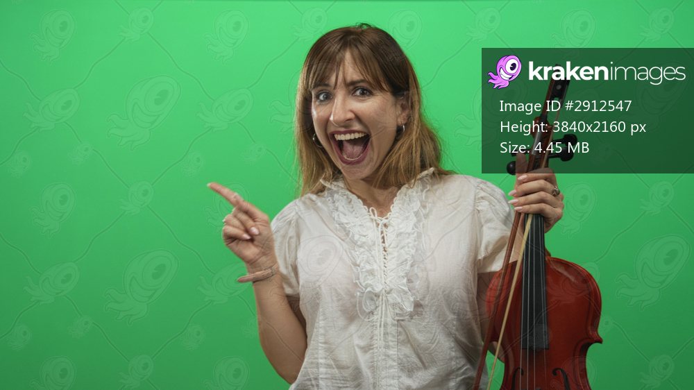 Woman holding violin and points finger to right in green screen studio, smiling with open mouth; excited performance.