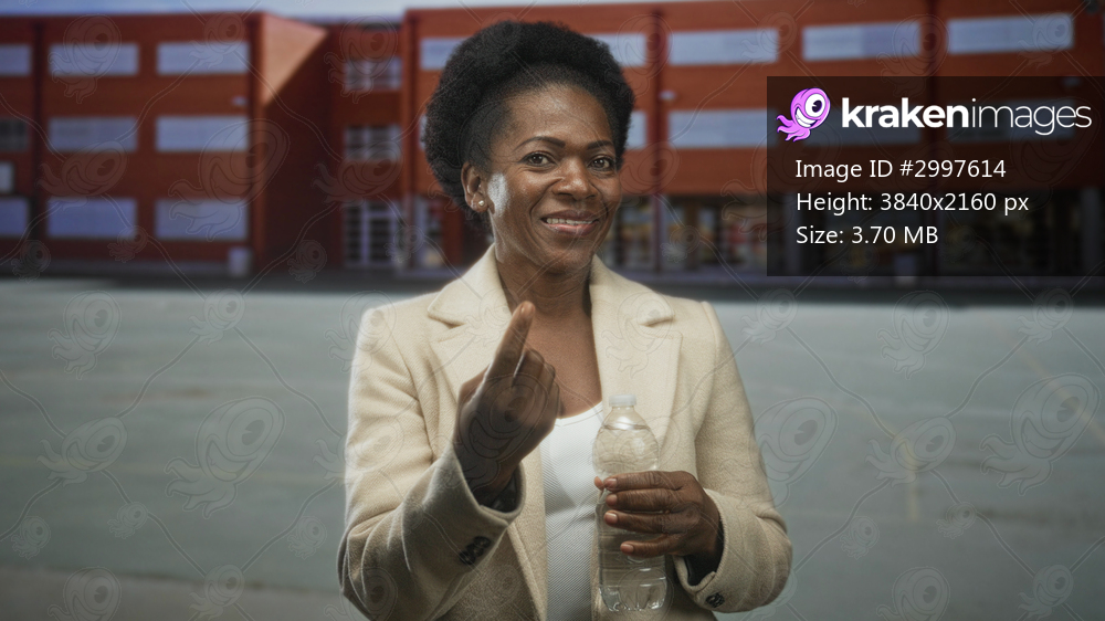 Woman holding water bottle and beckoning with fingers in front of brick school building; welcoming hydration community.