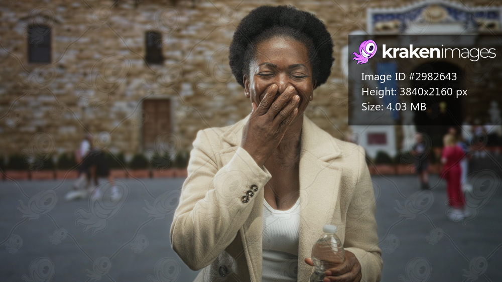 Woman holding water bottle and covering mouth while smiling in front of historic building in a city square; joy resilience.