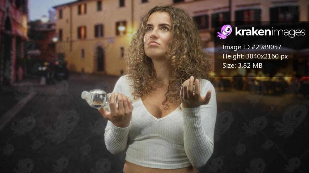 Woman holding water bottle, hand on chin thinking on street by outdoor cafe lights; contemplation pondering thought.