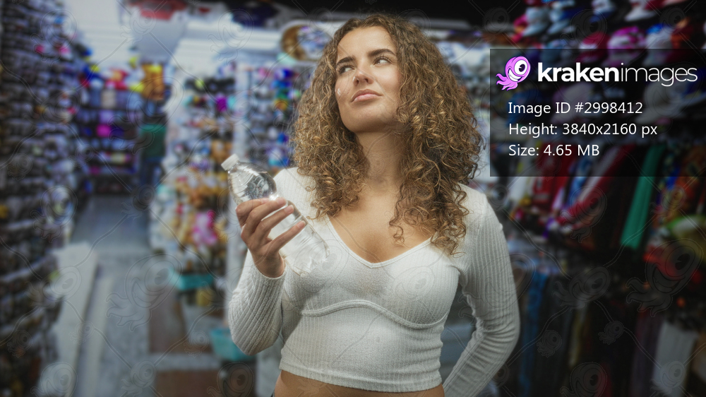 Woman holding water bottle, hand on hip, wearing white crop top with midriff visible in a building aisle; thoughtful curiosity.