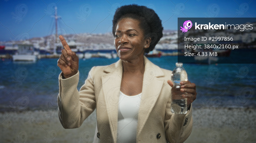 Woman holding water bottle and pointing finger at harbor shore, smiling and gesturing in a light coat; confidence wellness hydration.