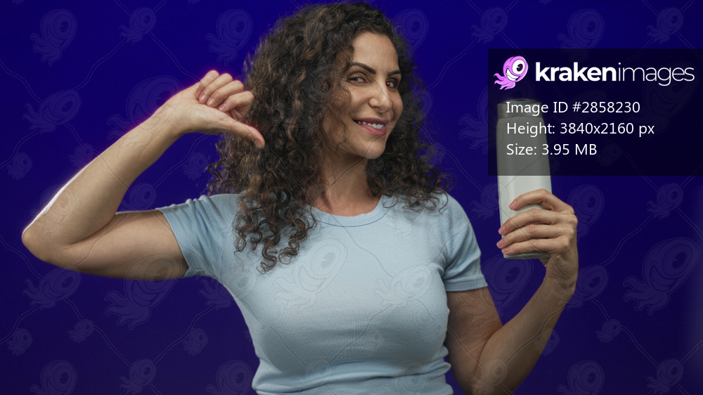 Woman holding white bottle and smiling with thumb to chest gesture in studio in front of deep blue wall; confidence.