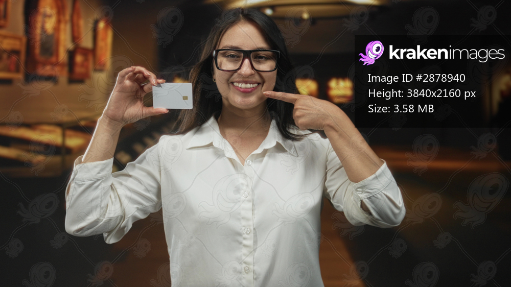 Woman holding white card and points finger to card in a museum building while smiling and wearing glasses; confidence membership trust.
