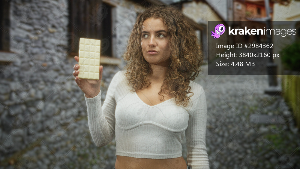 Woman holding white chocolate bar showing bare midriff on cobblestone street; confidence indulgence.