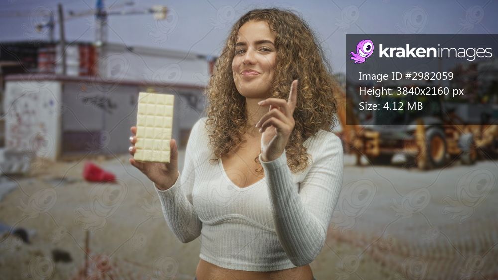 Woman holding white chocolate bar and smiling with eyes closed, pointing with hand on street in front of construction cranes and excavator; joy casual fun. - Kraken Images