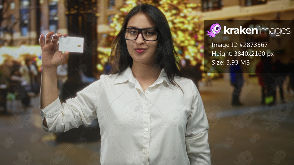 Woman holding white creditcard in raised right hand on crowded city street near holiday lights and storefronts; financial confidence.