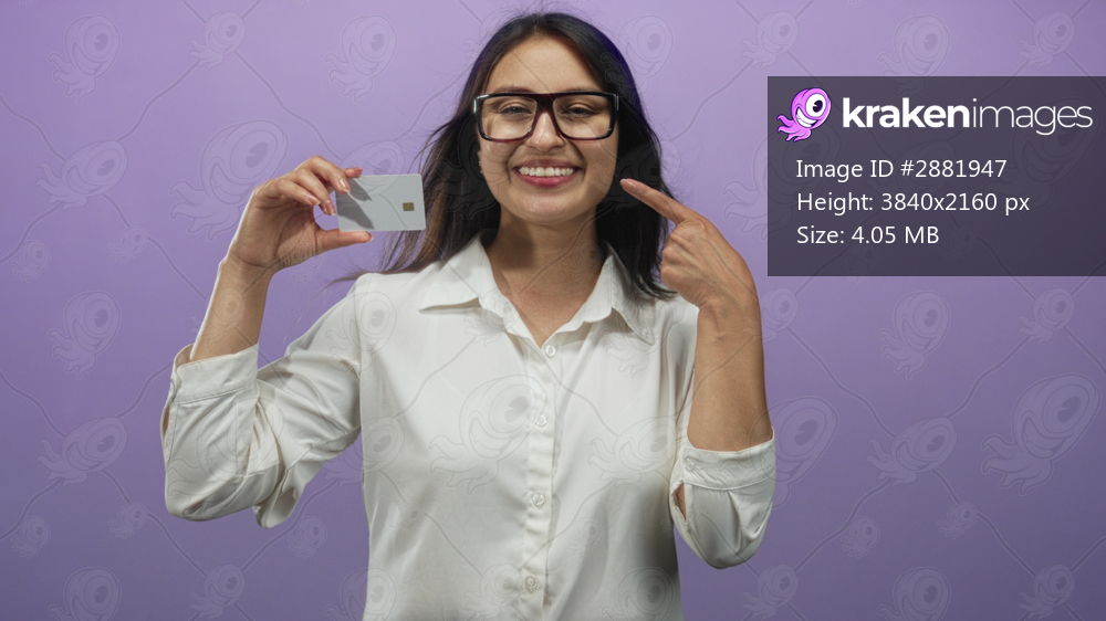 Woman holding white creditcard near face, smiling and pointing finger to card in purple studio with glasses and white shirt; trust.