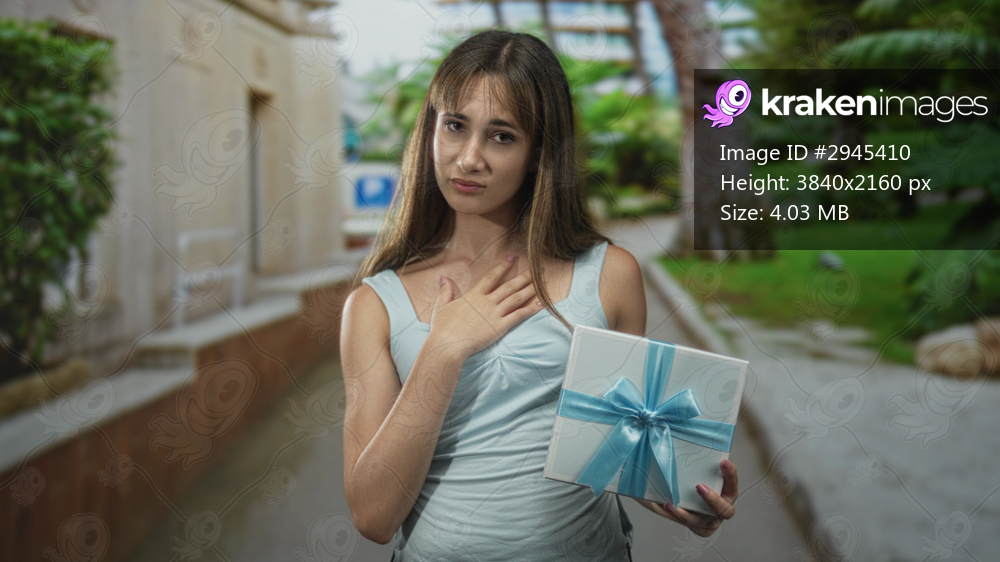 Woman holding white gift box with blue ribbon with hand on chest on street near building, with subtle expression; gratitude sincerity.