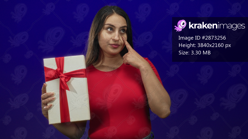 Woman holding white gift box with red ribbon, finger to cheek in studio against deep blue backdrop; playful curiosity.