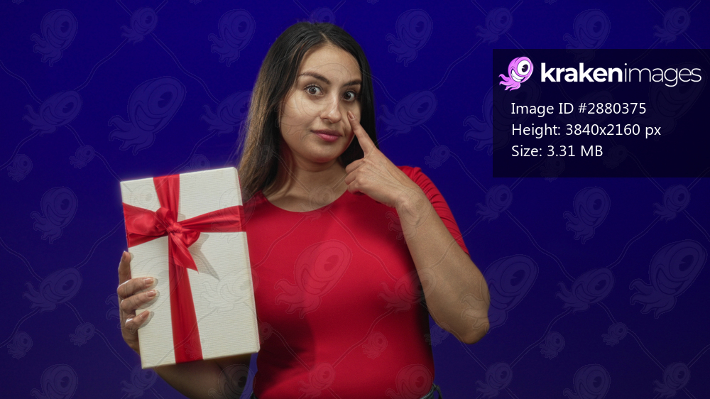 Woman holding white gift box with red ribbon, finger to cheek in studio against deep blue backdrop; playful curiosity.