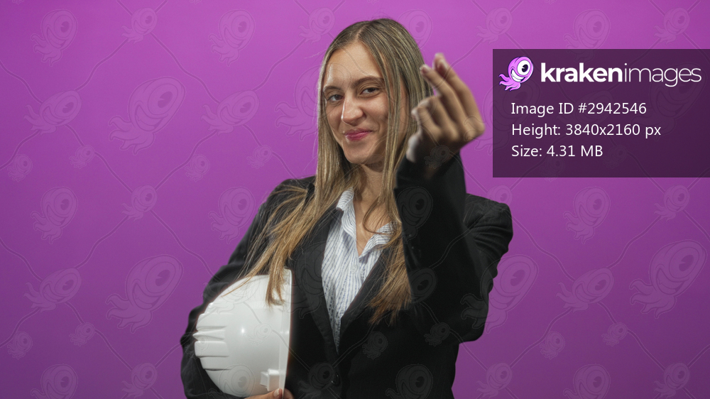 Woman holding white hard hat in one arm and making a finger heart gesture with her right hand in studio against a purple backdrop; playful confidence.
