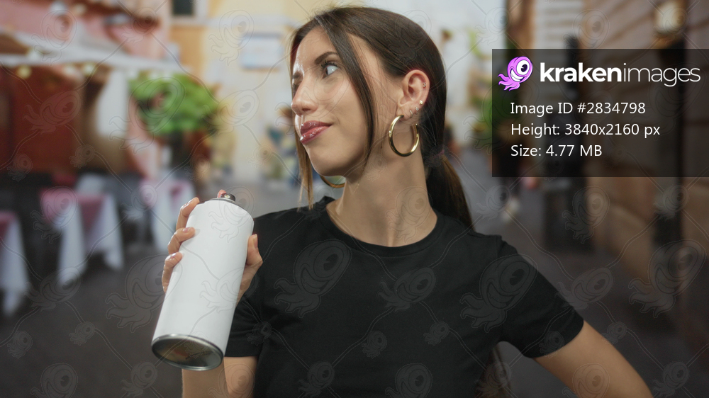 Woman holding white spraycan with bare arm on restaurant terrace wearing hoop earrings and glancing sideways; confidence.