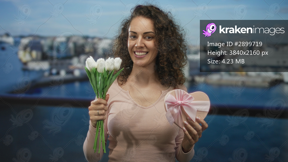 Woman holding white tulips and a pink heart gift on a cruise ship deck smiling while presenting flowers and gift; romance gifting joy.