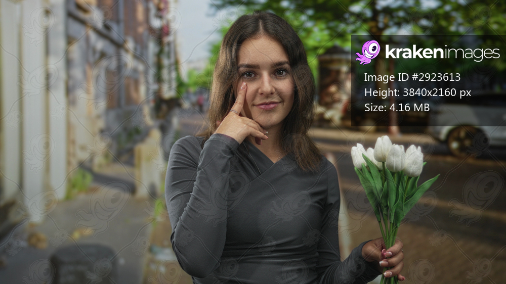 Woman holding white tulips and finger to cheek on a city street, wearing grey top and slight smile; contemplation.