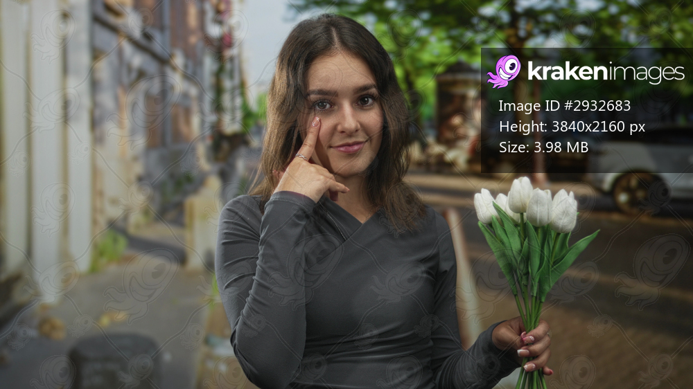 Woman holding white tulips and finger to cheek on a city street, wearing grey top and slight smile; contemplation.