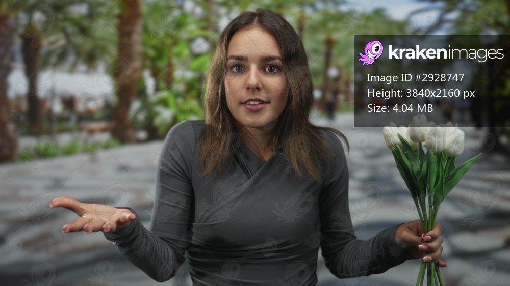 Woman holding white tulips and gesturing with open hand on a street, mid conversation; curiosity offering connection.