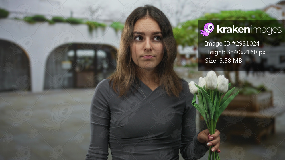 Woman holding white tulips on a street, hand visible and lips pursed in uncertain gesture; uncertainty apology.