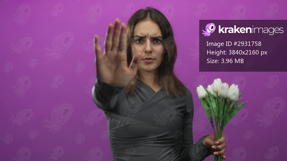 Woman holding white tulips with palm outstretched in studio purple backdrop, gesture to stop; boundary setting rejection.