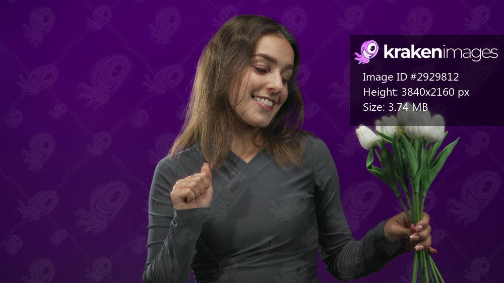 Woman holding white tulips and showing thumb up gesture with closed eyes smile in purple studio; gentle joy.