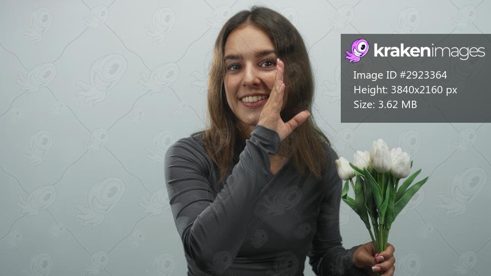 Woman holding white tulips and smiling with hand raised in studio against pale blue gray wall; happiness.