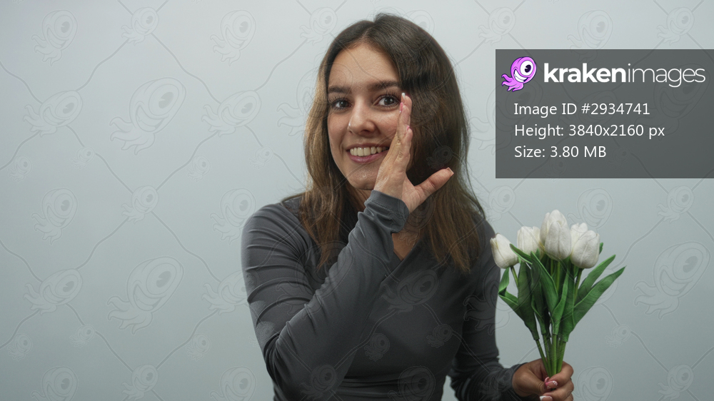 Woman holding white tulips and smiling with hand raised in studio against pale blue gray wall; happiness.