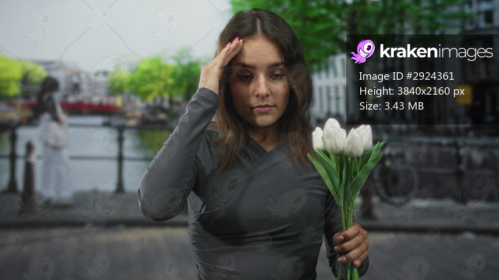 Woman holding white tulips touches her temple while wearing a gray wrap dress on an amsterdam street by a canal; quiet sadness reflection.