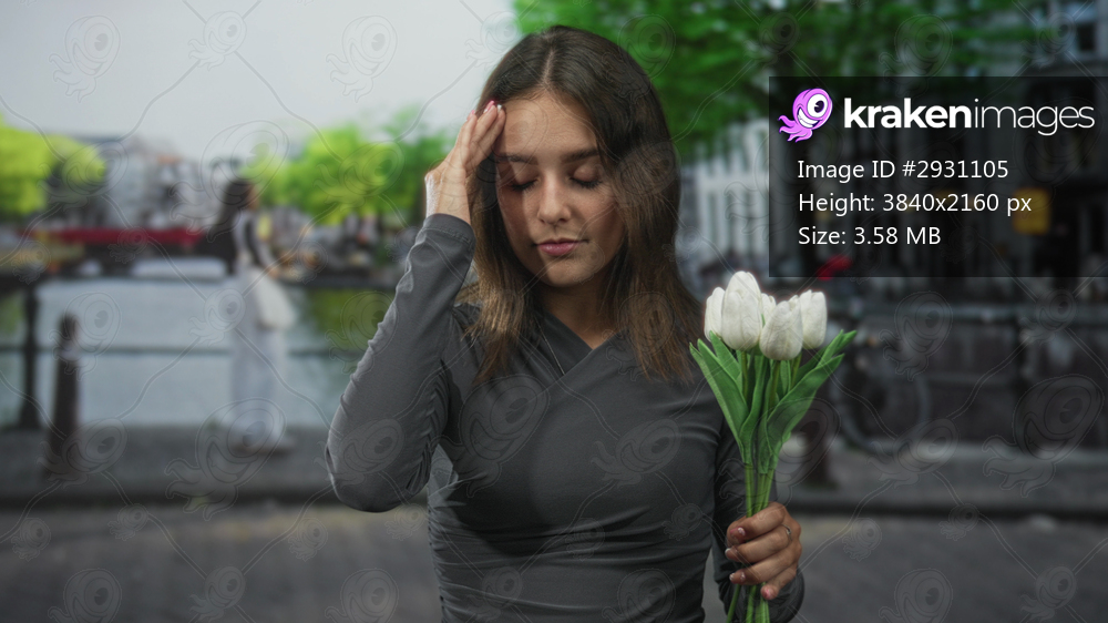 Woman holding white tulips touches her temple while wearing a gray wrap dress on an amsterdam street by a canal; quiet sadness reflection.
