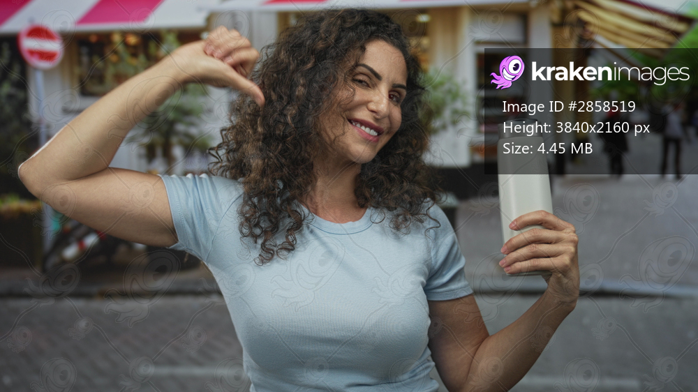Woman holding white water bottle and points thumb to herself on busy city street under storefront awning; confidence.