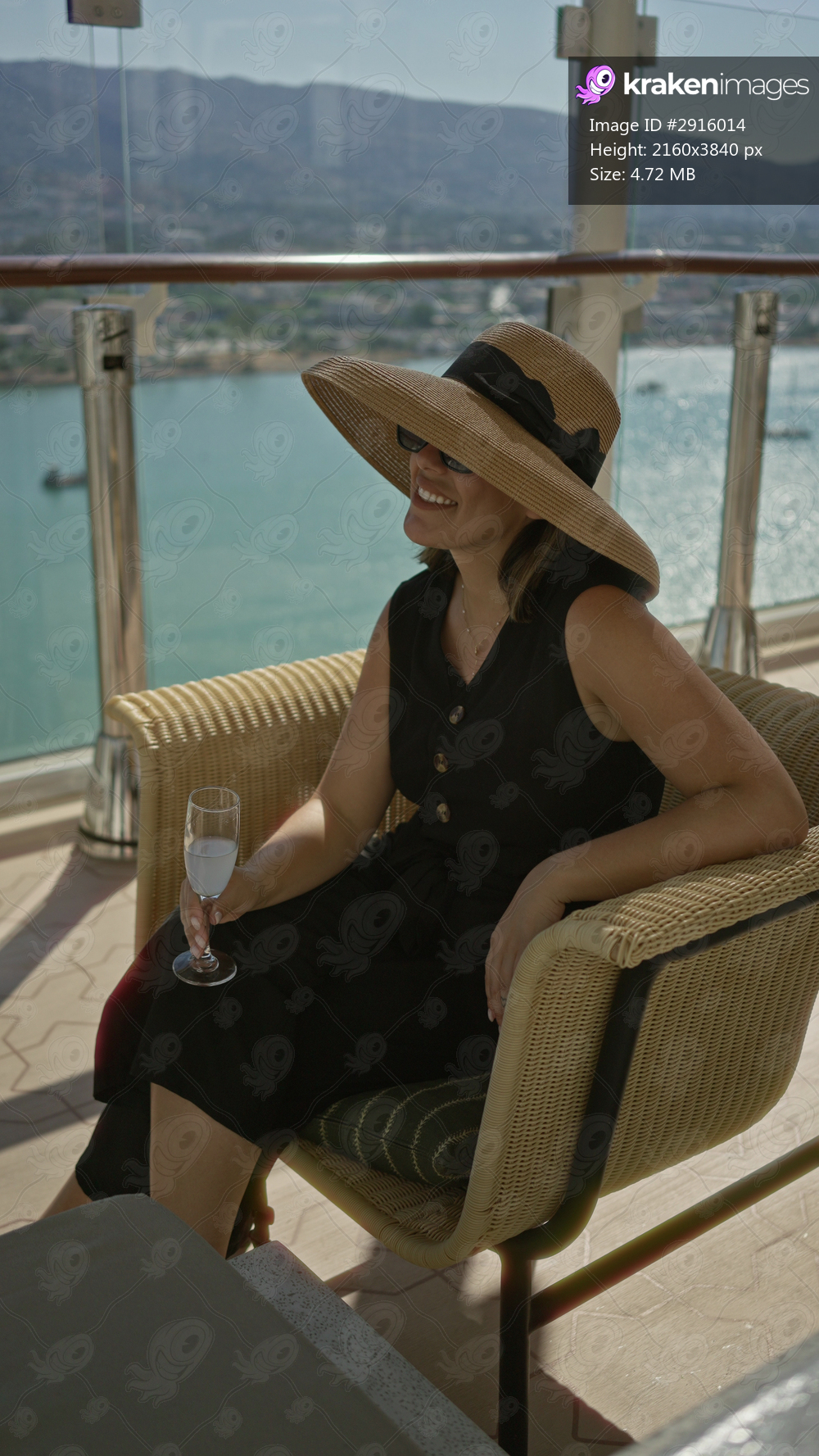 Woman holding wineglass and smiling, wearing wide brim hat and sunglasses while seated in wicker chair on cruise terrace with sea view; relaxation vacation. - Kraken Images