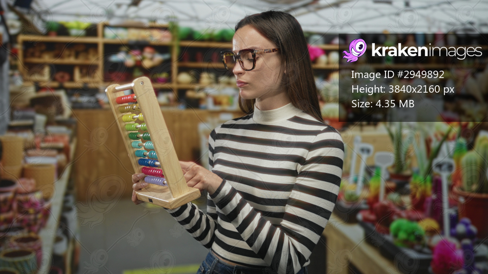Woman holding wooden abacus points finger to abacus in building flower shop market setting;thoughtful focus.