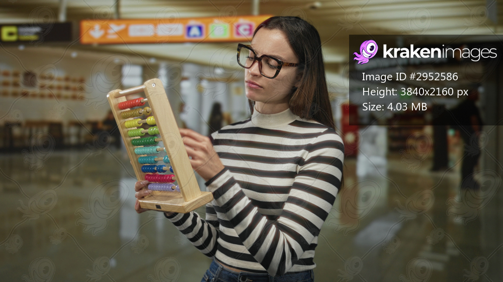 Woman holding wooden abacus and touching beads with hands while wearing striped turtleneck and glasses in airport terminal; concentration.