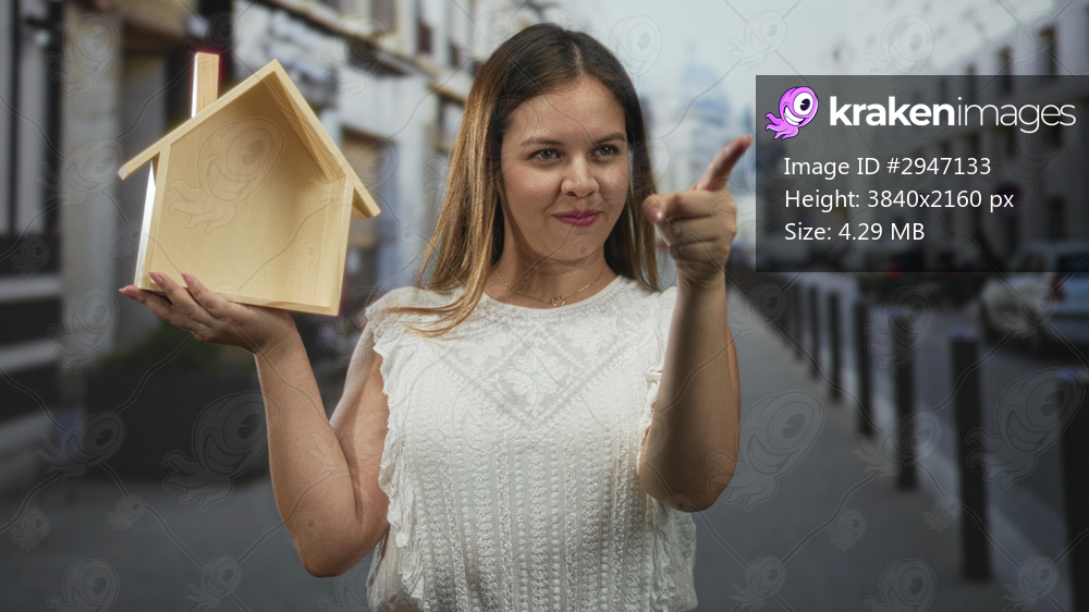 Woman holding wooden house model on street points finger forward while smiling; home ownership confidence.