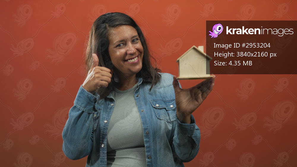 Woman holding wooden house model, pointing and giving thumbs up in studio; confidence homeownership.